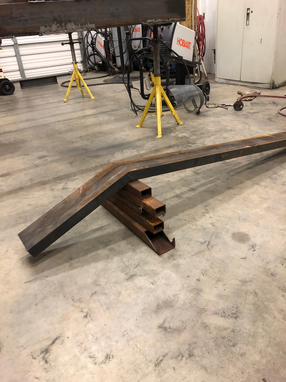 This week we added to the structural integrity of the frame of our trailer. We also were able to attach the tongue of the trailer that attaches to the vehicle pulling the trailer. We attached a protective cover for the hydraulic piston that acts as a debris cover and attachment point. We first welded on steel plates to the top of the trailer that provides structural stability to the frame and a surface for the dump bed frame to rest. Next we took the frame of the trailer and flipped it upside down on top of elevated stands. Once we got it up, we welded the underside of all the cross bracing and supports. This included the bracing for the hydraulic piston that holds it in place and protects the piston from debris. Finally, when it came to the tongue we had to learn how to cut an angle out of the C channel pieces so that we were able to bend them. We used a protractor and a air powered saw tool to cut angles out of the metal. After we put the metal on top of a fulcrum, made up of scrap material, we bent the metal to the desired angle. We double checked our measurements and welded the crease on the metal together. The tongue pieces were then clamped onto the trailer frame and lined up to the desired position.